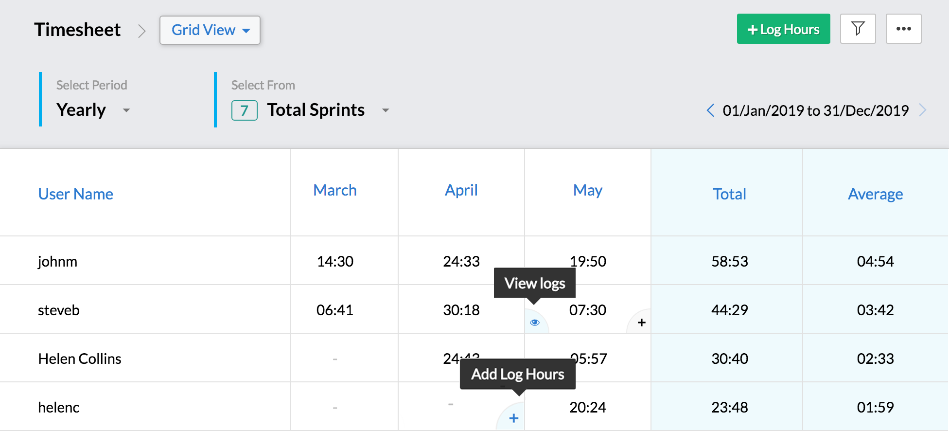 - Grid view - Displays all the users and the hours logged by them either by week, month, year, or quarter.