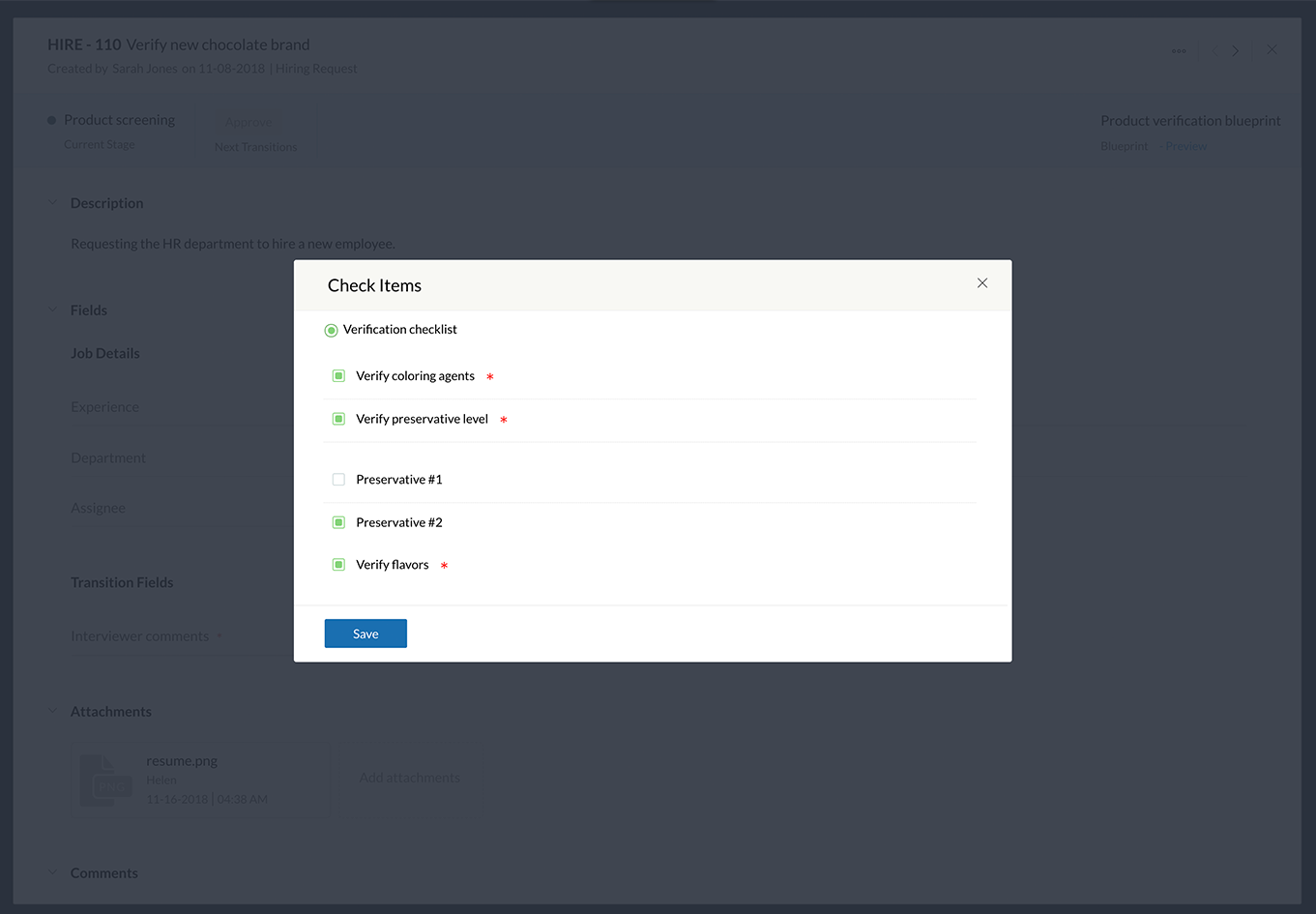 transition is being performed in the job, a pop-up with the checklist items will appear. Upon checking an item, the corresponding sublist items appear.