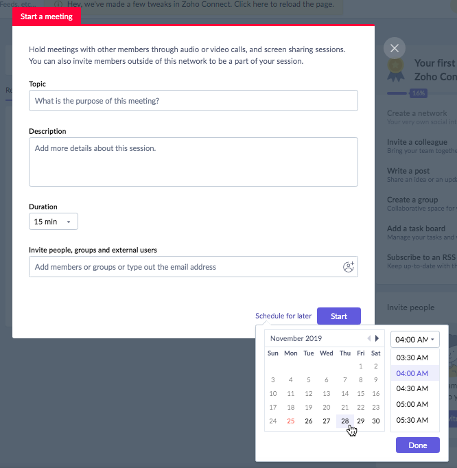 The online meeting integration of Zoho Meeting in Zoho Connect lets you conduct online meetings with colleagues and groups in your organization, using audio, video, and screen sharing. You can also add external contacts like partners and clients to your online meetings.