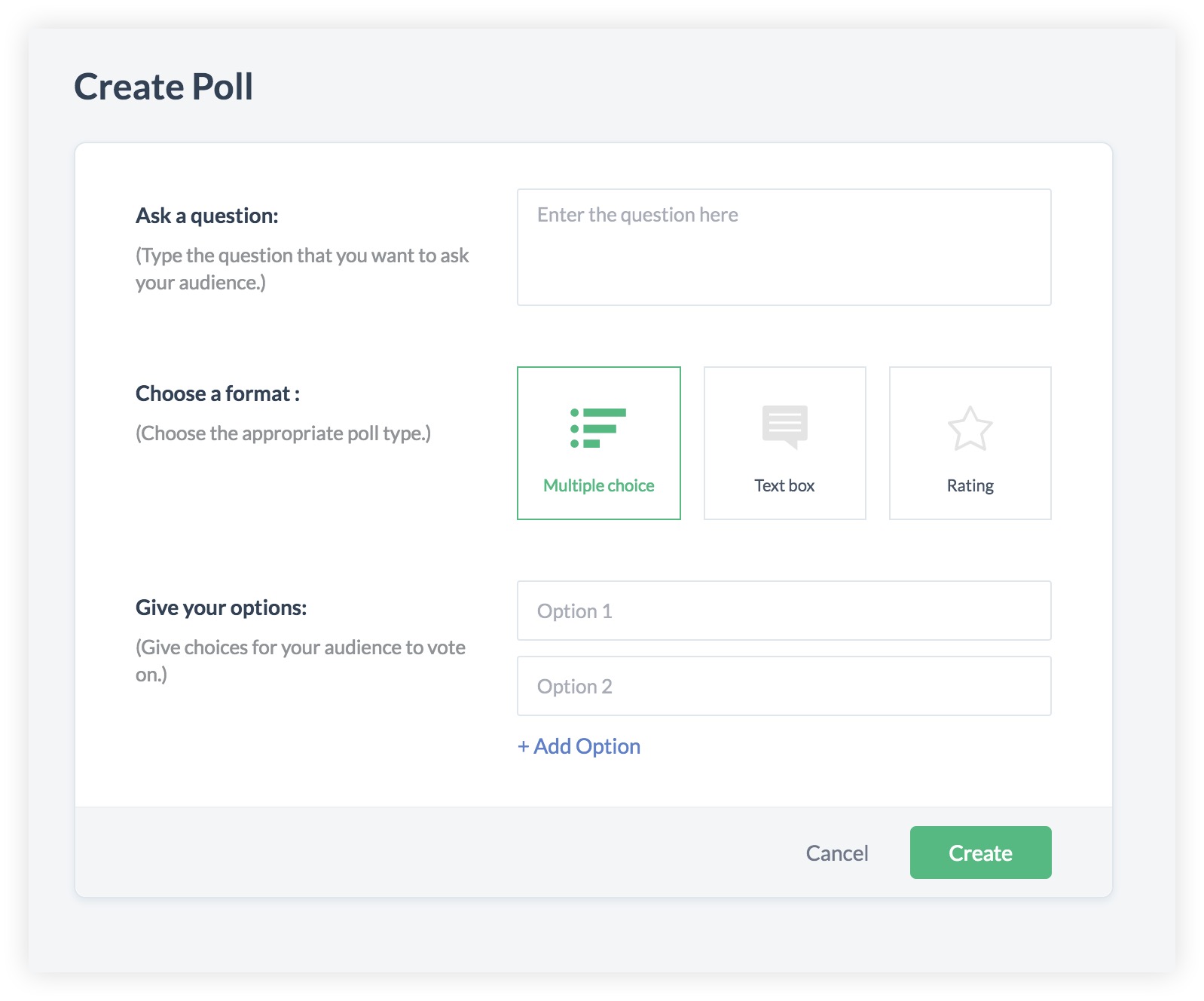 - Choose a poll format: Multiple Choice, Text box, or Rating. (Learn more about creating polls.)