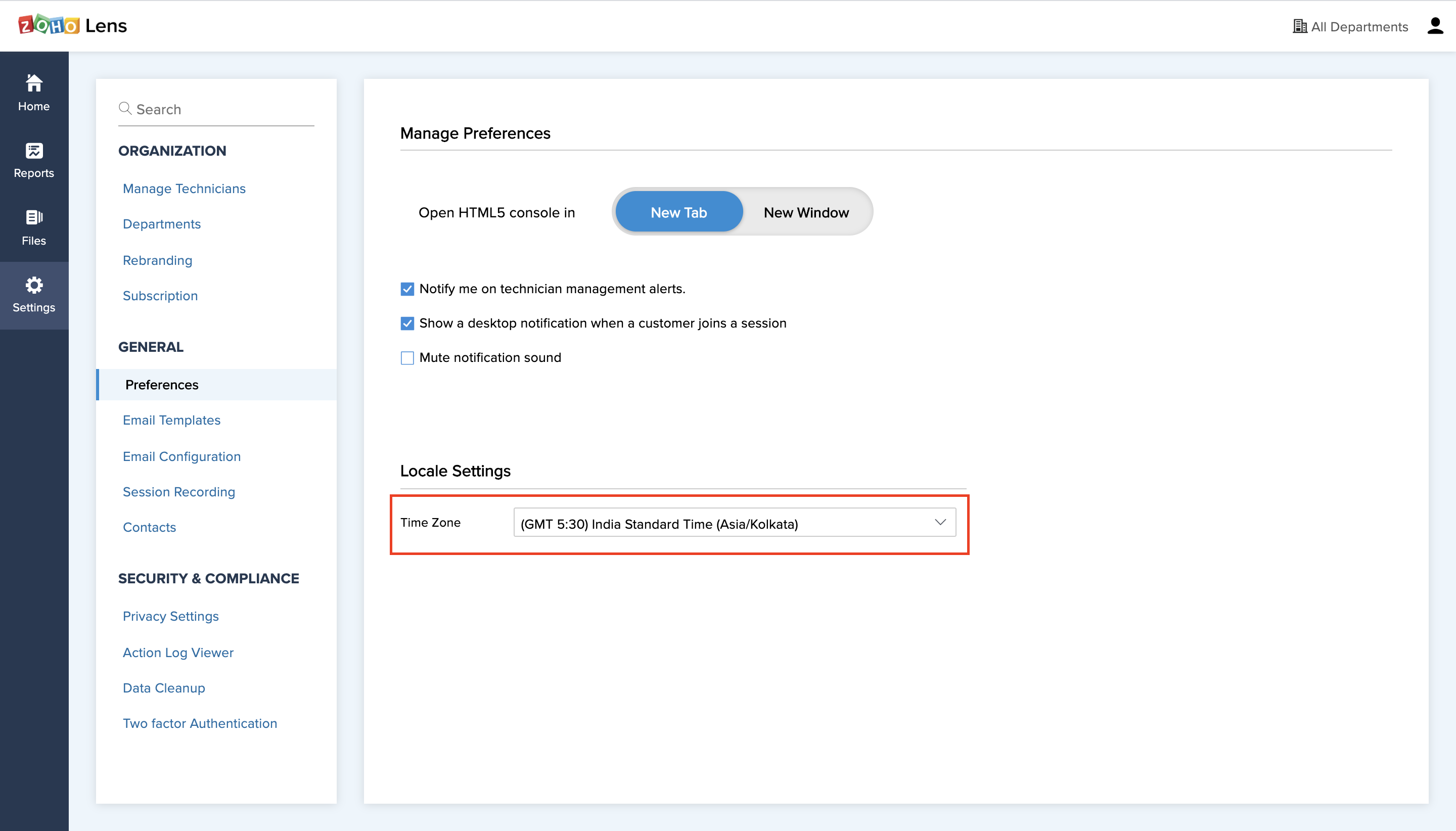 The Super Admin or Admin can use the Preferences section to set how the technician console will open in the browser when a new session is initiated. You can also enable or disable the notification that the technician receives when a customer joins a session or if any changes are made in the user management section, and set the time zone.