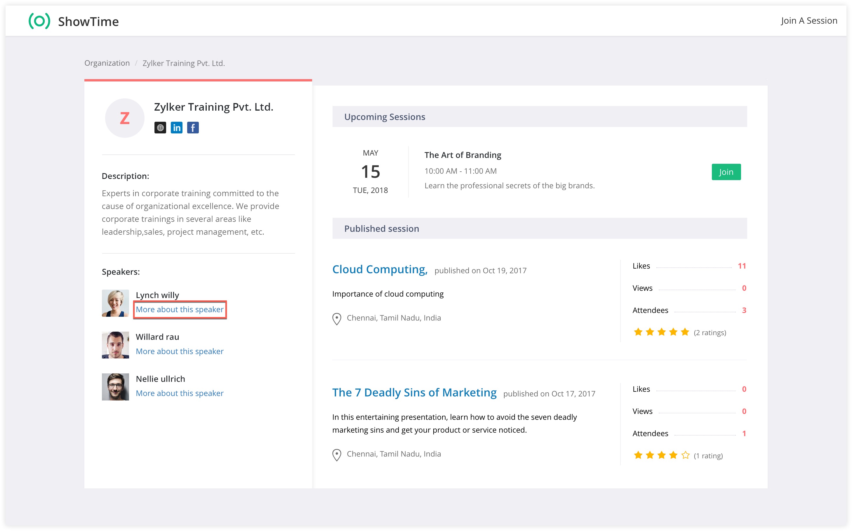 On the right side of your ShowTime Profile are the sessions you have published. They can contain the following information: