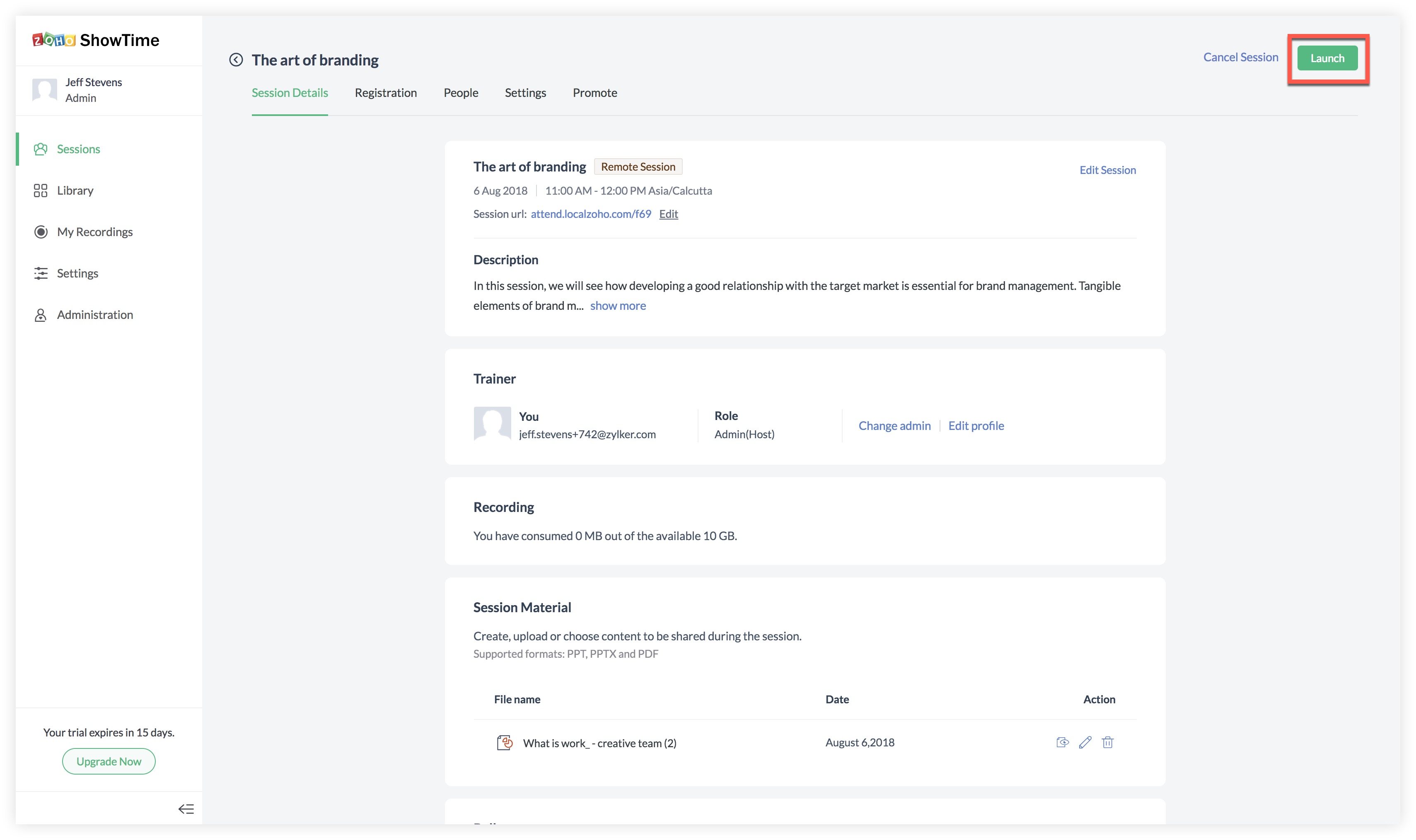 You can customize the session settings like the session details, managing registrations, inviting attendees, promoting your session etc. Click here to learn how to customize your session. Once you finish customizing your session settings,