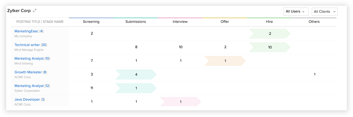 Zoho Recruit provides a consolidated view of all your job openings and their associated hiring pipelines. This will be available on your Dashboard.