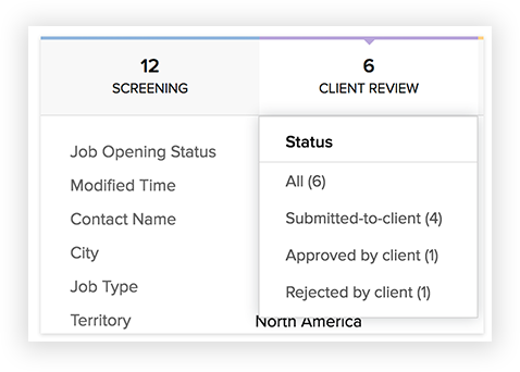 The stages that you see contain appropriate Candidate Statuses. For example, the Client Review stage contains all the client-related candidate statuses such as Submitted to Client, Approved by Client" and Rejected by Client. Candidates with any of these statuses will therefore be grouped in the Client Review stage.