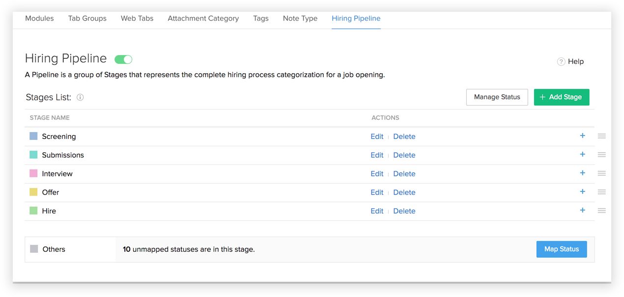 Note: At least one candidate status must be mapped with a stage for it to show up in the pipeline.