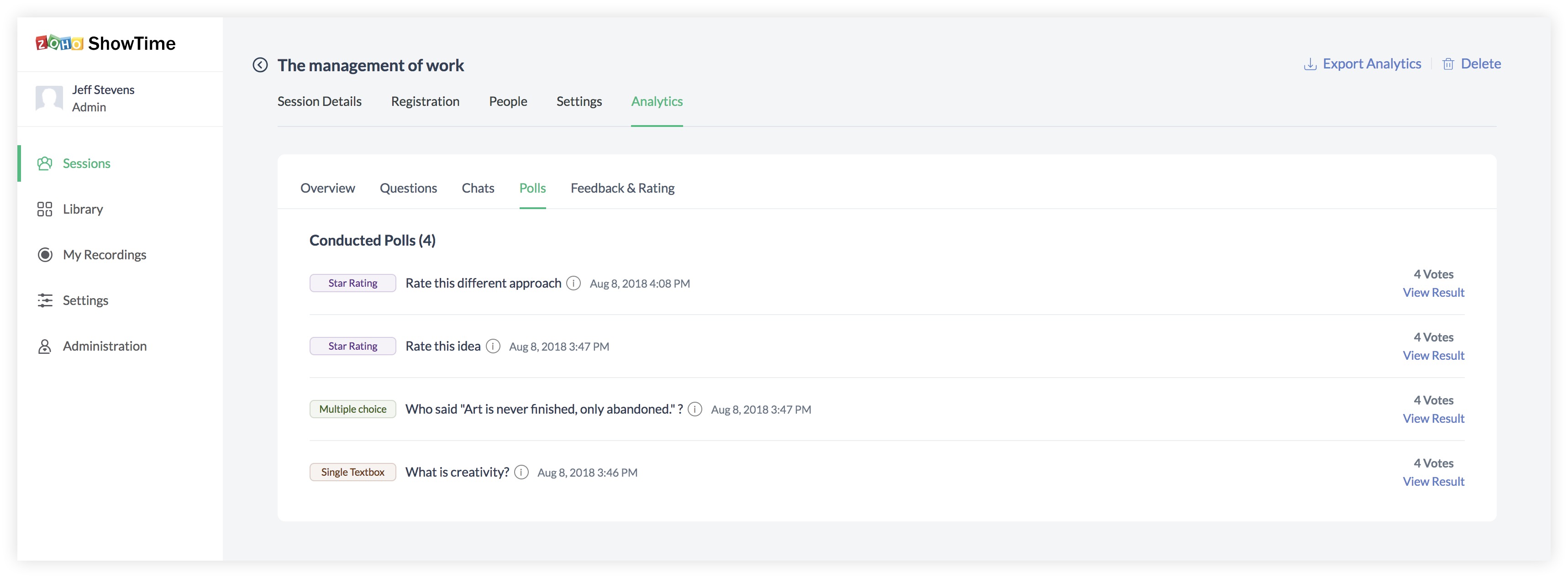A list of conducted polls will be available with the question and number of votes received. Click View Results on a particular question to analyze the results. You will be able to view the detailed analytics of the particular poll that you conducted: