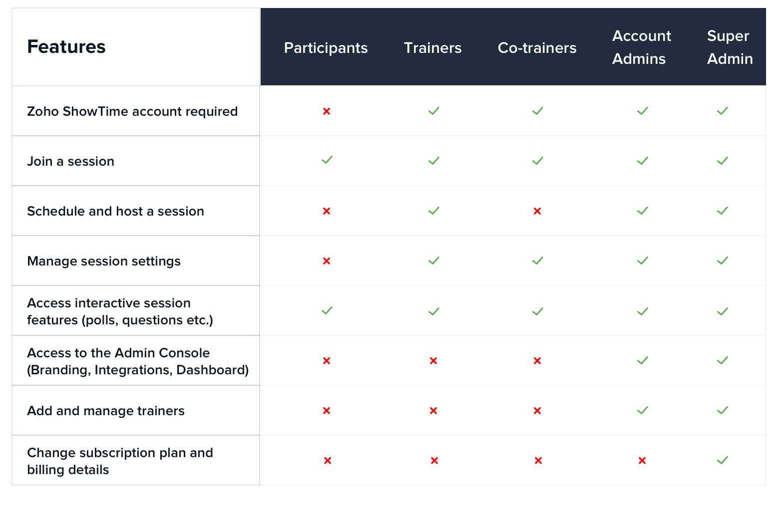 Super Admin: The person who purchases the subscription on behalf of the organization and creates the organization account. The Super Admin has the most wide-ranging privileges in the Admin Center. By default, all subscription plans to ShowTime come with two User Licenses (one Admin role and one Trainer role).