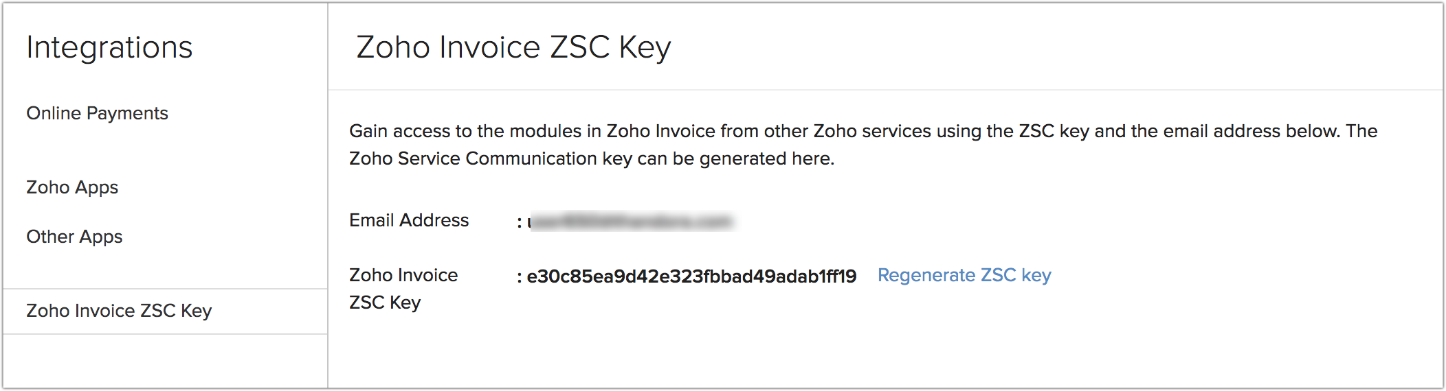 3. Click Zoho Invoice ZSC key tab and then click Regenerate ZSC key.