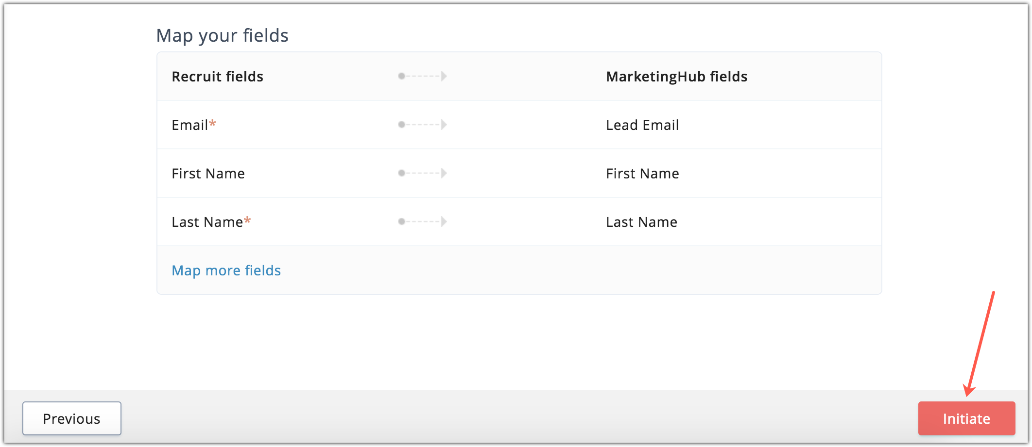 Basic fields like email address, first name and last name are mapped by default. You can map other fields according to your requirement by clicking on Map more. You can edit or delete a mapped field by clicking the respective icon displayed beside the mapped field. Click Initiate once you're done.
