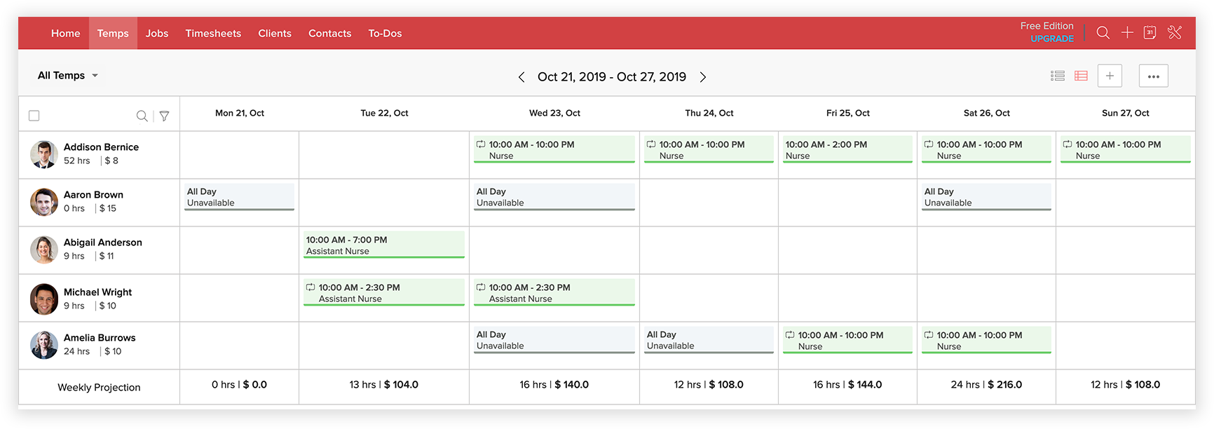 7. Weekly Projection at the bottom of the temps list. Displays total working hours and total revenue generated by all temps each day.
