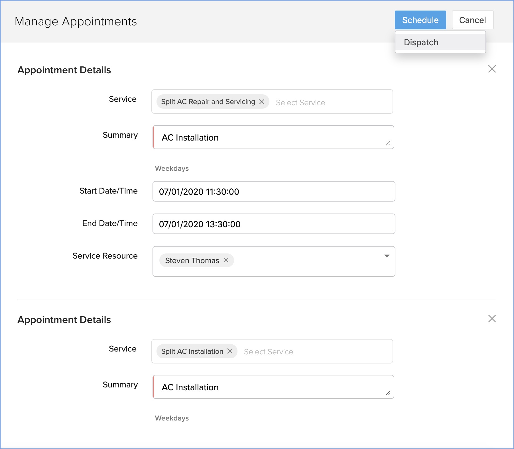 *Instead of scheduling, you can also choose to dispatch the appointment (see screenshot below).