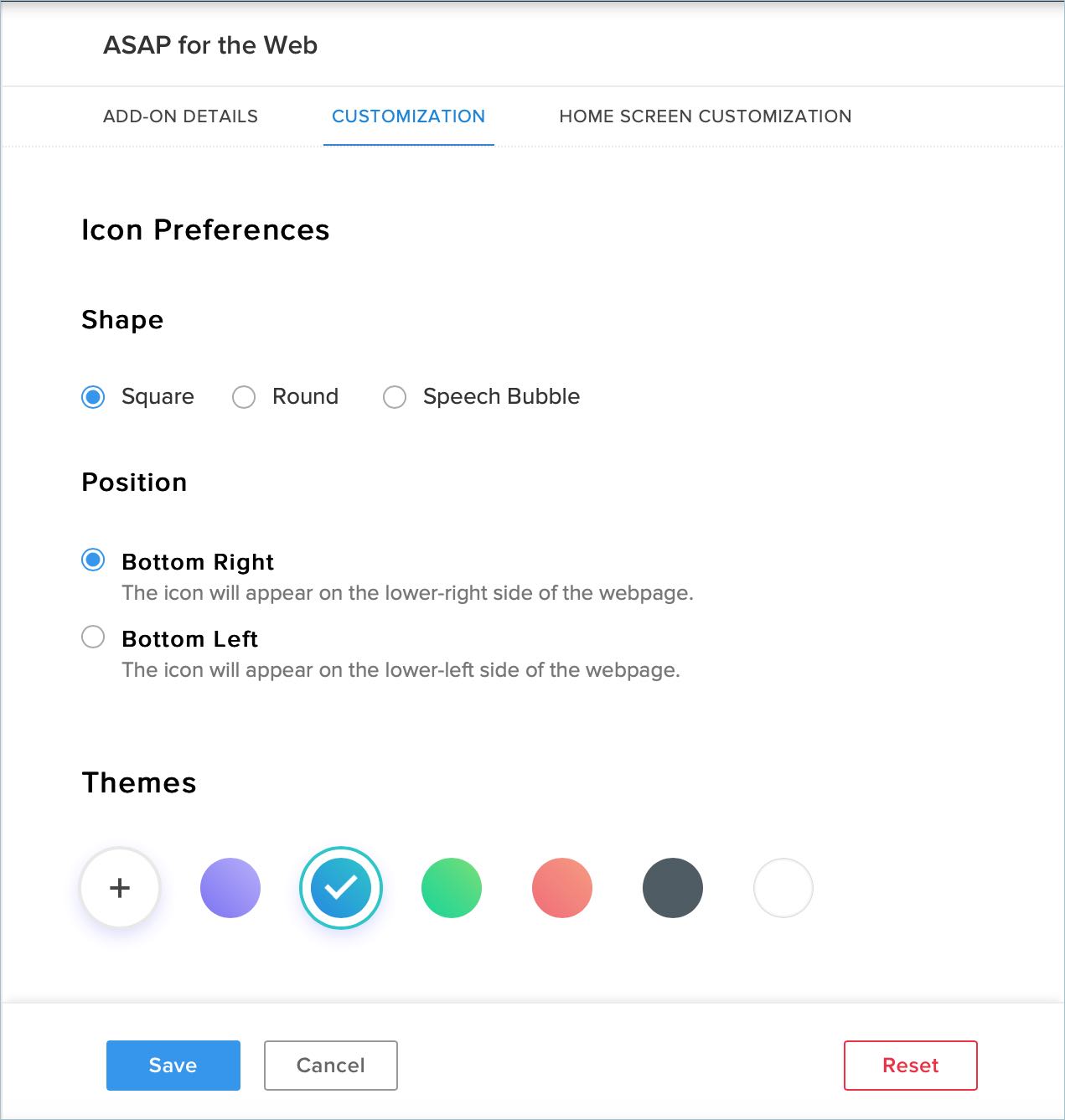 Under the Customization tab, choose the icon, shape, position, and theme options you prefer. You can use one of the default themes or define a custom theme for your add-on window.