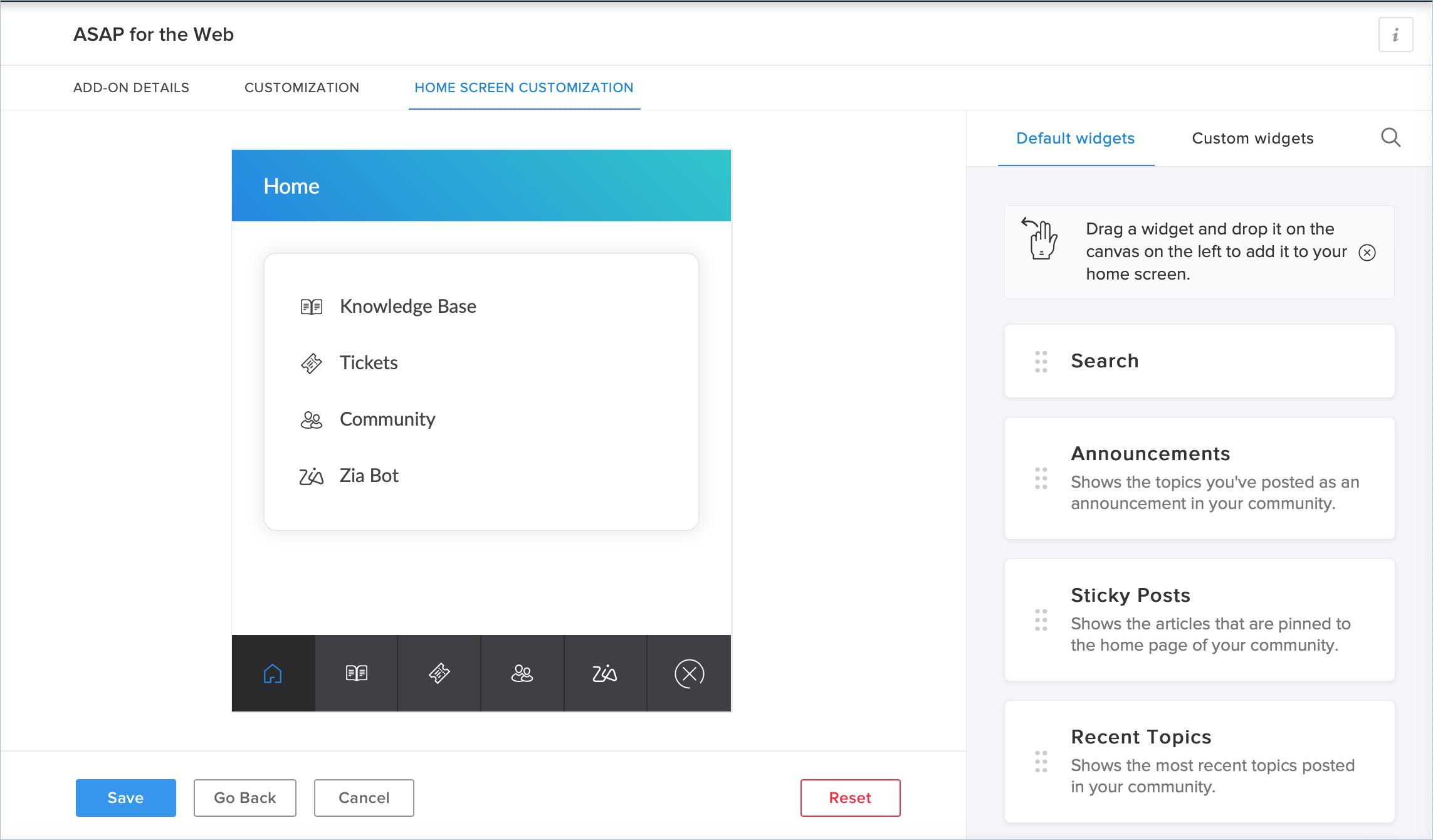 If you are satisfied with the preview, click the Save button. Else, click Go Back, make the necessary changes, and then click the Save button. The home screen of your ASAP add-on will now reflect the changes you made.