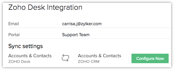 - In Zoho Desk Integration page, under Sync Settings click Configure Now.