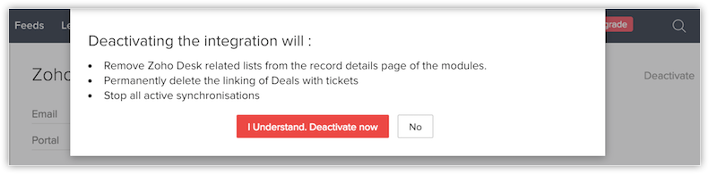You can choose to deactivate Desk Integration with your CRM account. Deactivation will cease the integration from both accounts.