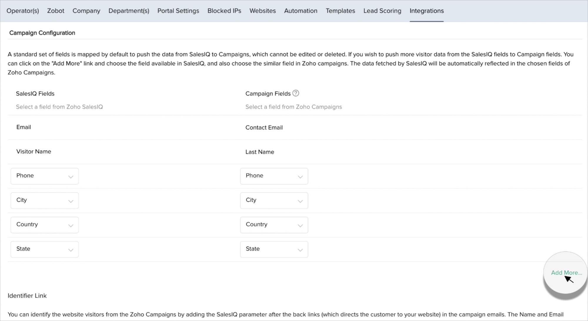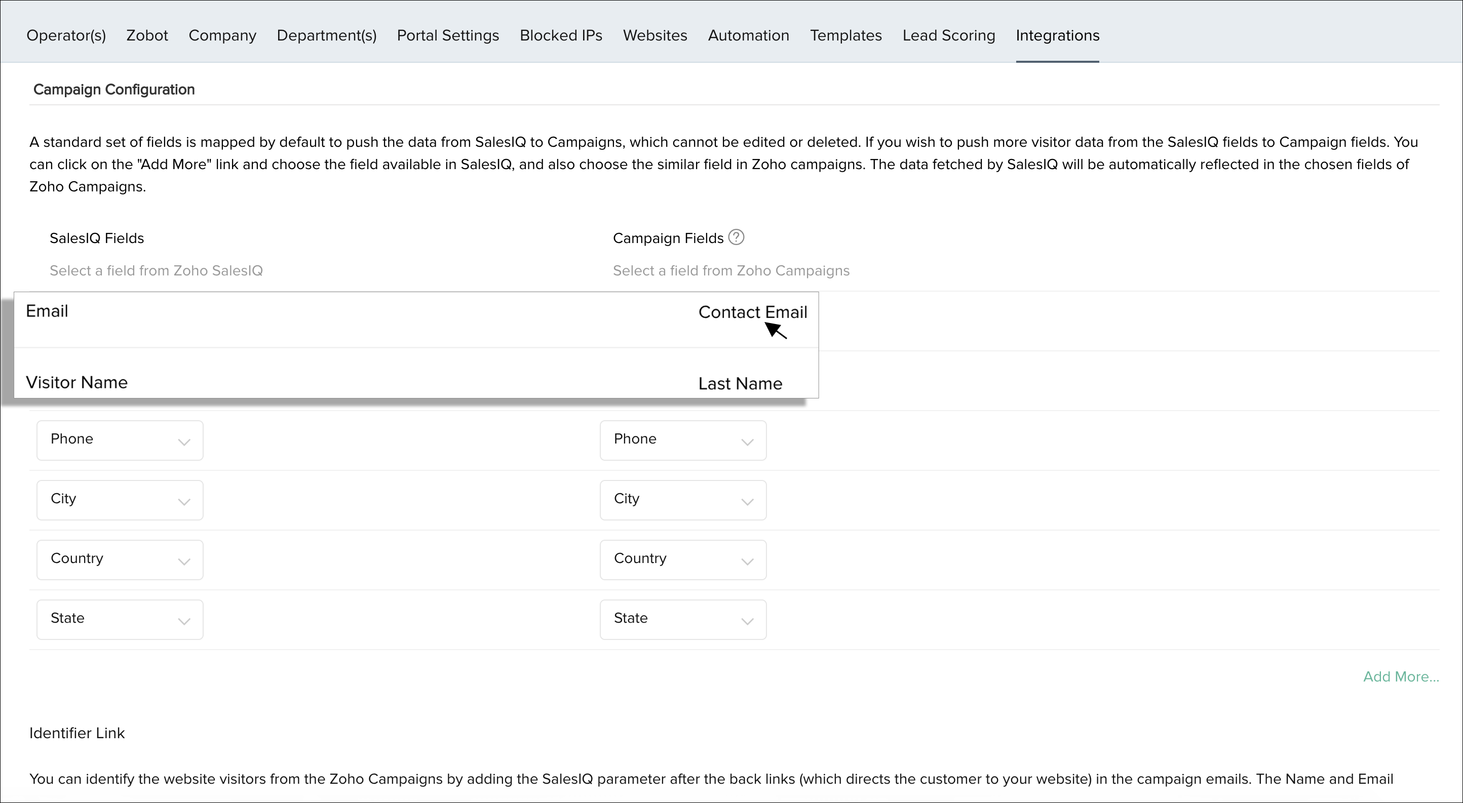 - Choose the field you would like to map in SalesIQ from the drop-down under "SalesIQ Fields".